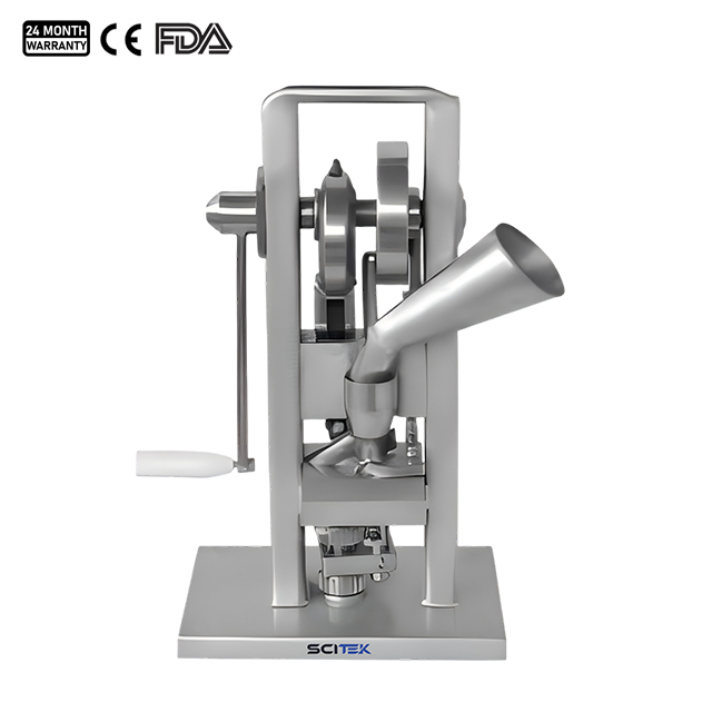The manual single punch tablet press is a small desktop manual continuous punch tablet press, which can punch round tablets within 12 mm and is suitable for pharmaceutical, chemical, food, medical institutions and other departments. This machine has the advantages of no need for electricity and easy to carry. It can be manually cranked and the required tablets can be obtained by replacing molds of different specifications.
