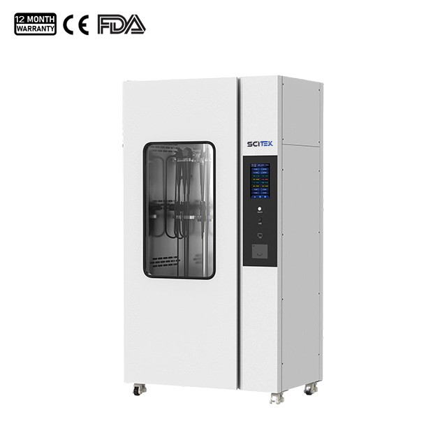 Purification system is used to maintain the space at cleanliness ISO 5. Dehumidification system removes mositure from inside and consequently prevent the proliferation of microorganisms. Vertical storage complies with guide from scope manufacturers on endoscope storage. Concentrically positioned hangers can be rotated to facilitate access to endoscopes.